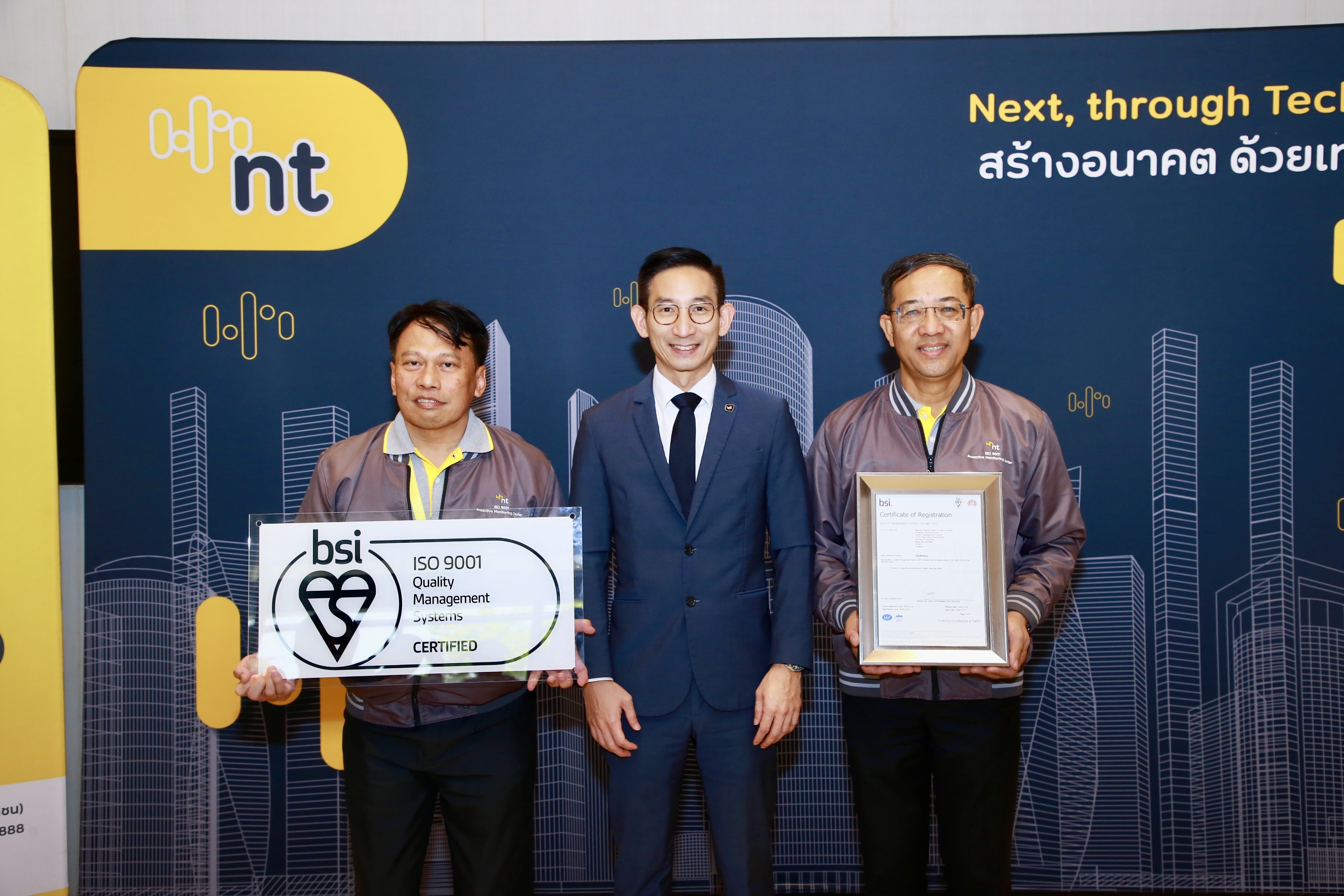 บริษัท โทรคมนาคมแห่งชาติ จำกัด (มหาชน) หรือ NT ได้รับใบรับรองระบบบริหารคุณภาพ ISO 9001:2015 สำหรับการให้บริการศูนย์เฝ้าระวัง และแจ้งเหตุวงจรขัดข้อง (Proactive) อาคารโทรคมนาคม บางรัก โดย นายปิยะ รัชตวรคุณ ผู้ช่วยกรรมการผู้จัดการใหญ่ กลุ่มขายและปฏิบัติการลูกค้า ภาคตะวันออก เป็นผู้แทน NT รับมอบประกาศนียบัตรจาก นายกุลธัช บุญบงการ ผู้จัดการประจำประเทศไทย บริษัท บีเอสไอ กรุ๊ป (ประเทศไทย) จํากัด