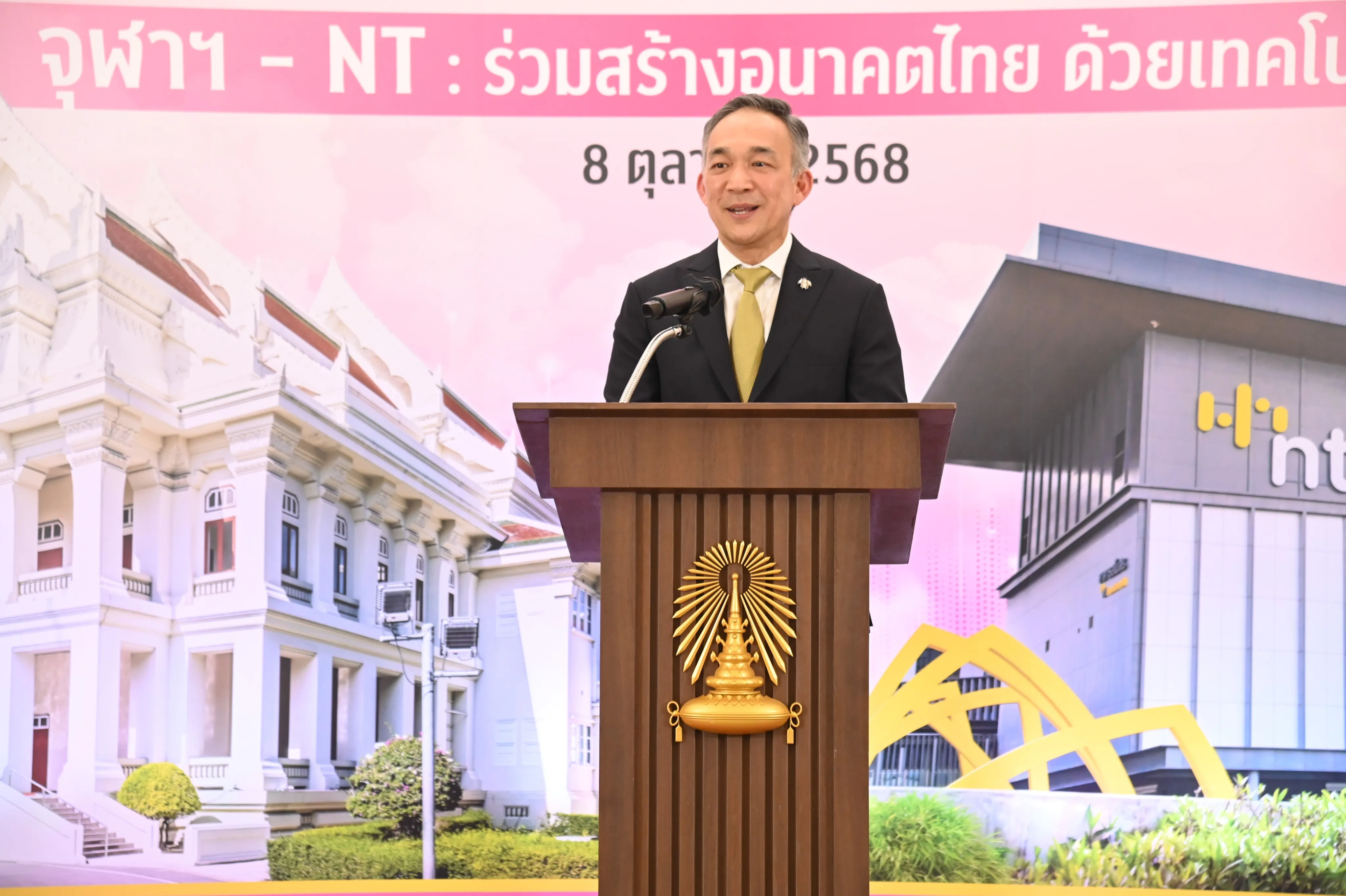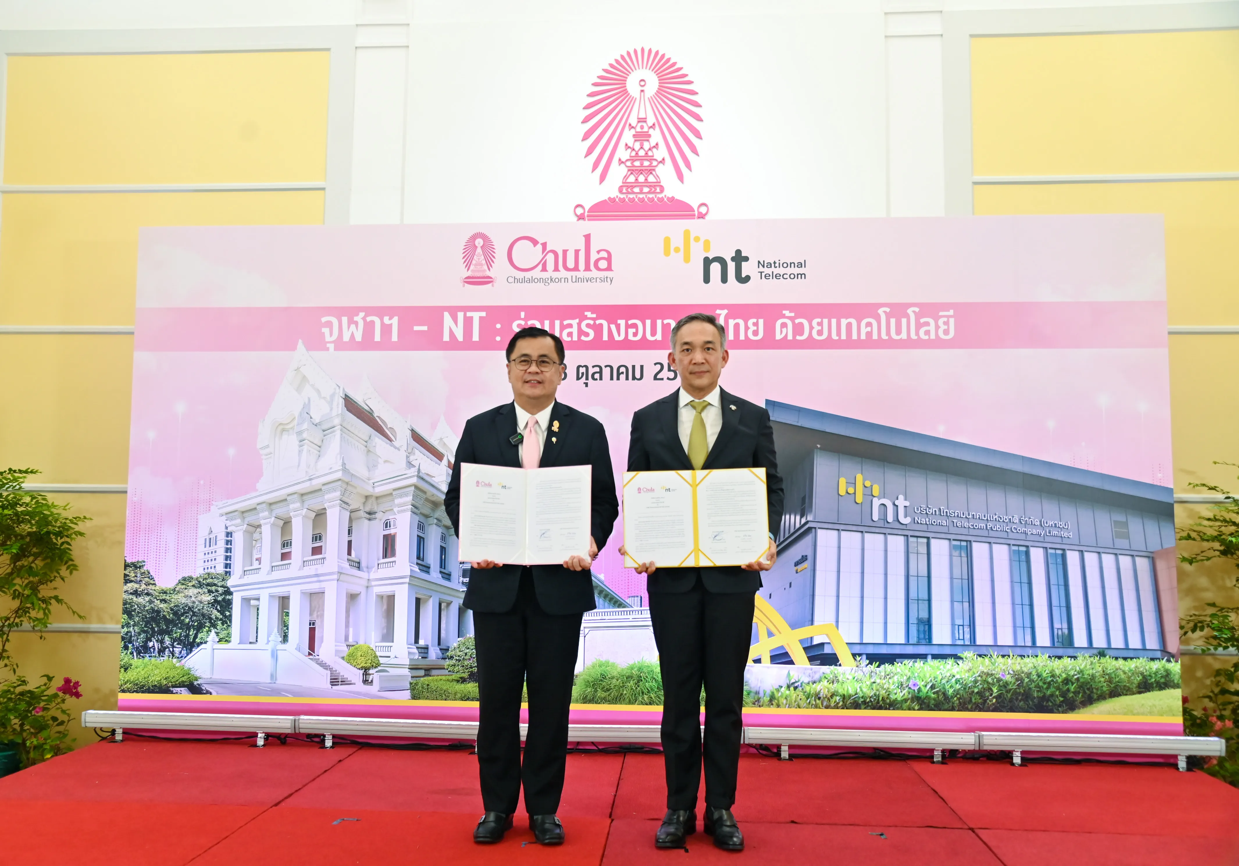 พันเอก สรรพชัยย์ หุวะนันทน์ กรรมการผู้จัดการใหญ่ บริษัท โทรคมนาคมแห่งชาติ จำกัด (มหาชน) หรือ NT และ ศ.ดร.วิเลิศ ภูริวัชร อธิการบดีจุฬาลงกรณ์มหาวิทยาลัย ร่วมลงนามการจัดทำข้อตกลงความร่วมมือร่วมสร้างอนาคตไทยด้วยเทคโนโลยี โดยมีวัตถุประสงค์เพื่อเป็นการส่งเสริมการเรียนรู้และพัฒนาศักยภาพของนิสิตจุฬาลงกรณ์มหาวิทยาลัยผ่านโครงการสหกิจศึกษา นิสิตจะมาปฏิบัติงานจริงในโครงการแผนงานต่างๆ ในองค์กรที่มีทั้งในปัจจุบัน และที่กำลังจะเกิดขึ้นเพื่อเติมเต็มองค์ความรู้ของนิสิตก่อนจบการศึกษา รวมถึงการส่งเสริมทักษะด้านเทคโนโลยีใหม่ๆ เช่น Cybersecurity, Data Science, Data Engineering, Software Development เพื่อเตรียมความพร้อมรับมือตลาดแรงงานในอนาคต และร่วมกันสนับสนุนโครงการกิจกรรมที่เกี่ยวข้องกับสิ่งแวดล้อม สังคม และธรรมาภิบาล กิจกรรมเพื่อการเรียนรู้ตลอดชีวิต (Lifelong Learning) ให้เข้าถึงคนทุกกลุ่มทั่วประเทศ ผ่านเครือข่ายและศูนย์บริการ ของNT ที่มีอยู่ทั่วประเทศ เมื่อวันพุธที่ 8 ตุลาคม 2568 ณ เรือนจุฬานฤมิต จุฬาลงกรณ์มหาวิทยาลัย ถนนพญาไท กรุงเทพฯ