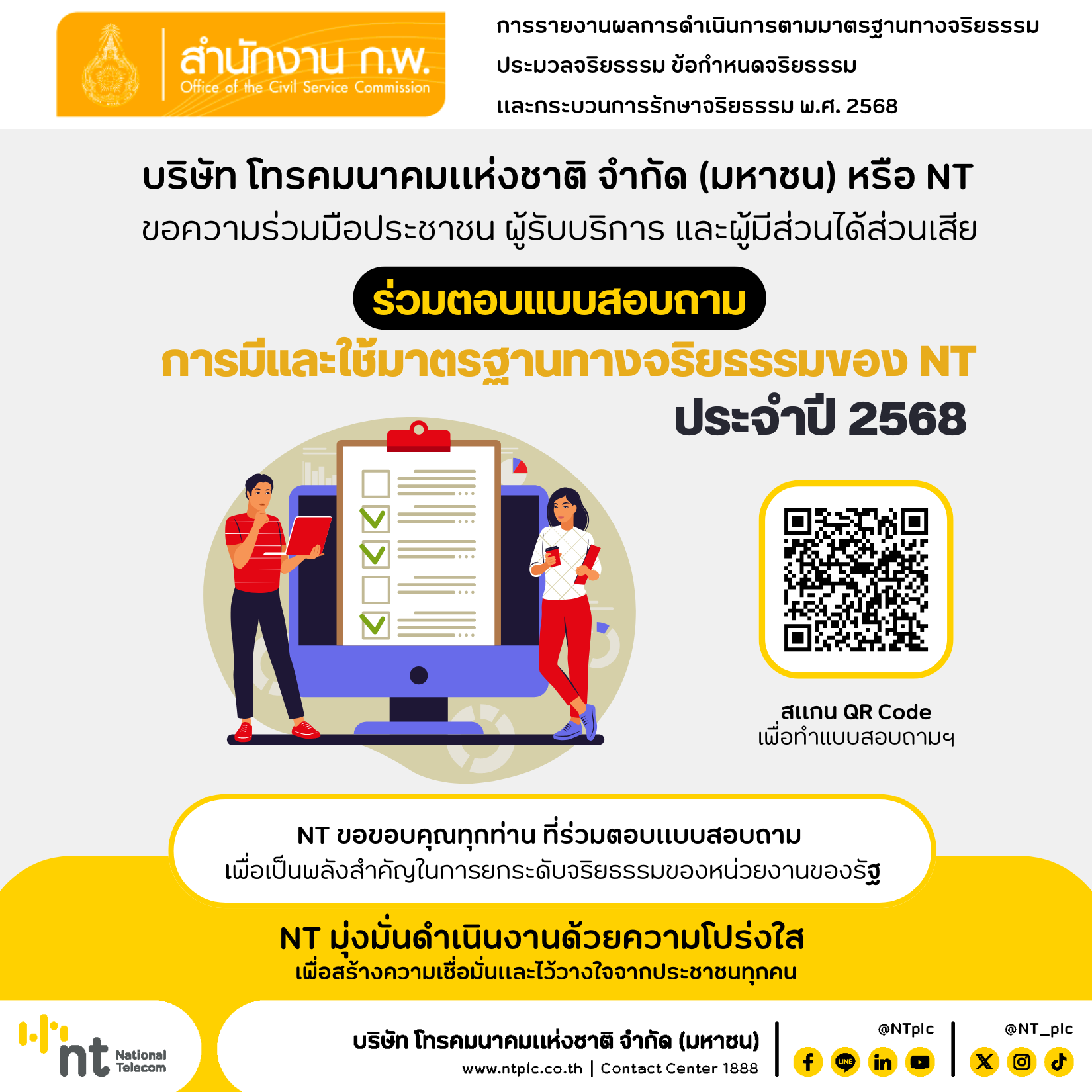 NT ขอความร่วมมือประชาชน ผู้รับบริการ และผู้มีส่วนได้ส่วนเสีย ร่วมตอบแบบสอบถาม การมีและใช้มาตรฐานทางจริยธรรมของ NT ประจำปี 2568