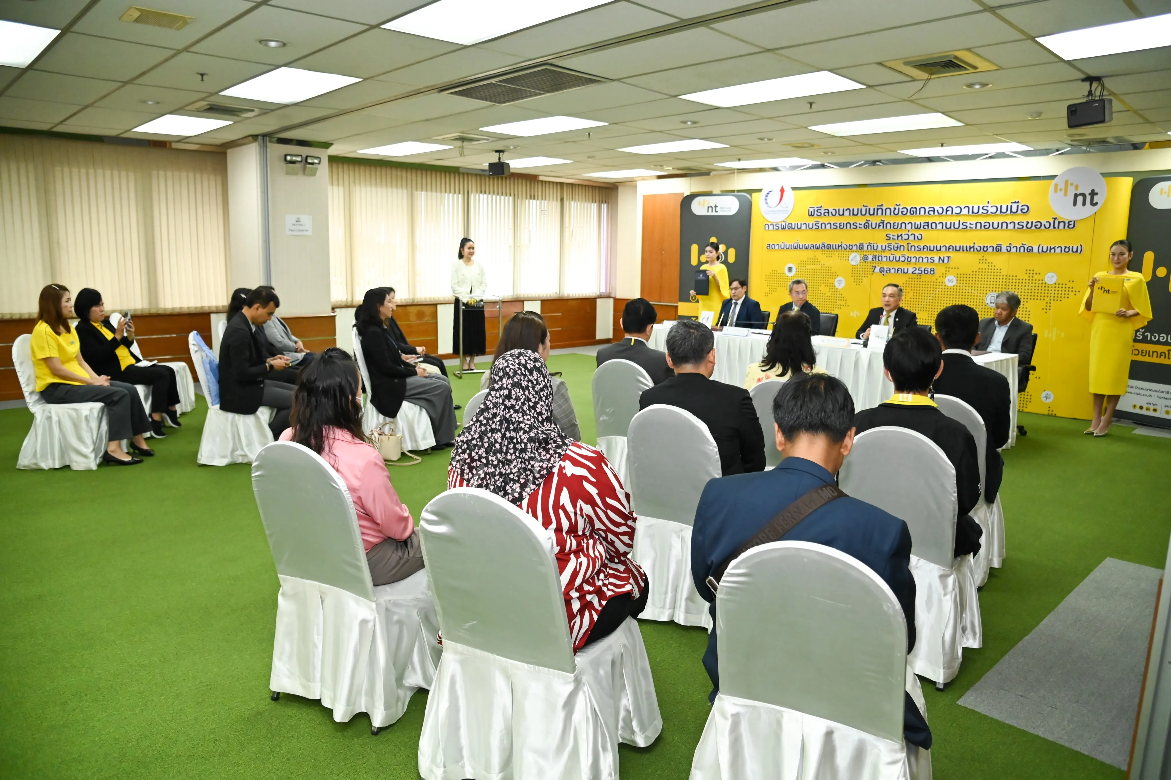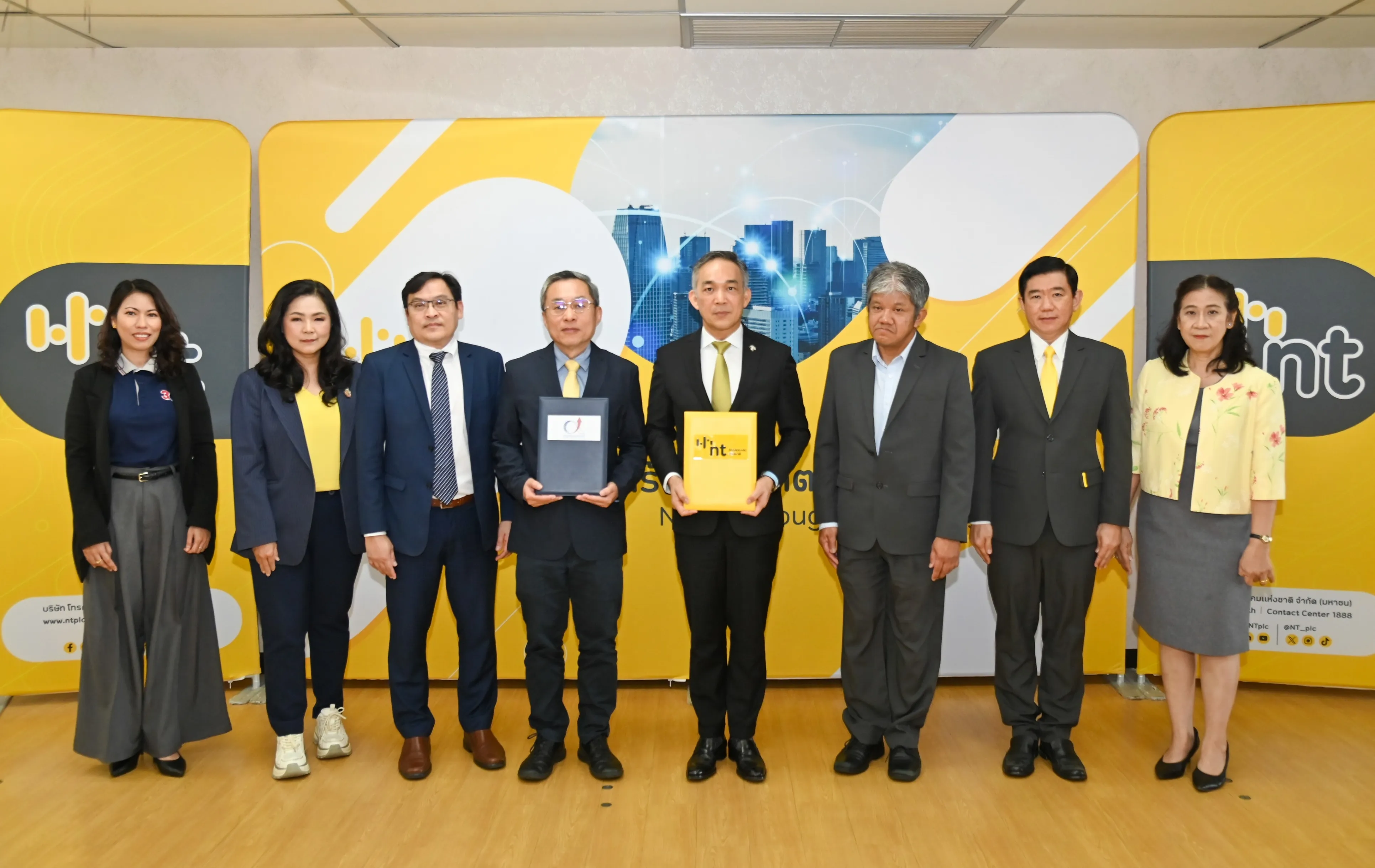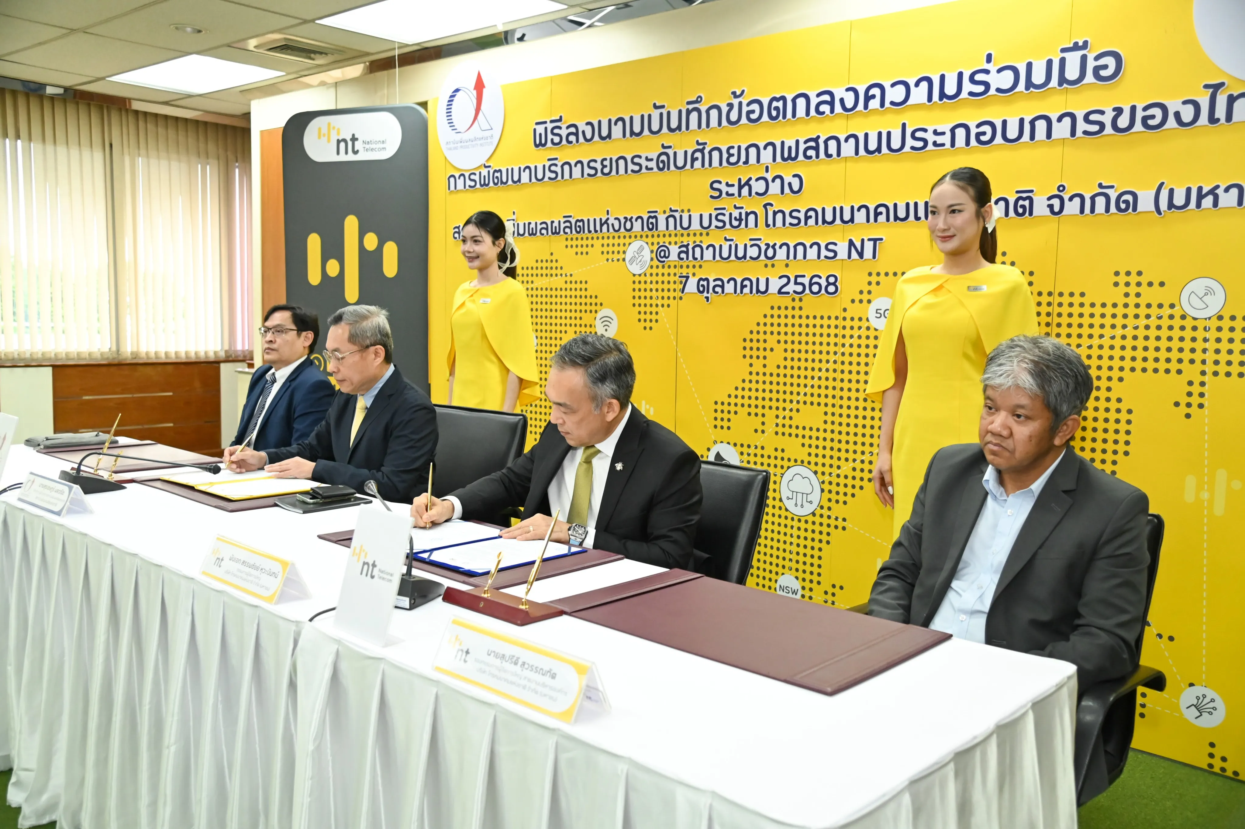 วันที่ 7 ตุลาคม 2568 ณ ห้องประชุม 1 ชั้น 3 อาคารกาญจนาภิเษก สถาบันวิชาการ อำเภอเมืองนนทบุรี จังหวัดนนทบุรี บริษัท โทรคมนาคมแห่งชาติ จำกัด (มหาชน) หรือ NT ลงนามบันทึกข้อตกลงความร่วมมือ ว่าด้วยการพัฒนาบริการยกระดับศักยภาพสถานประกอบการของไทย กับ สถาบันเพิ่มผลผลิตแห่งชาติ เพื่อผนึกกำลังในการส่งเสริมสนับสนุนการยกระดับทักษะด้านเทคโนโลยีดิจิทัลให้แก่บุคลากรในภาคส่วนต่าง ๆ ให้มีความพร้อมทางด้านดิจิทัล สามารถเป็นกำลังหลักในการเปลี่ยนผ่านองค์กรไปสู่ดิจิทัลได้อย่างยั่งยืน โดย พันเอก สรรพชัยย์ หุวะนันทน์ กรรมการผู้จัดการใหญ่ บริษัท โทรคมนาคมแห่งชาติ จำกัด (มหาชน) และนายสุรเชษฎ์ พลวณิช รักษาการผู้อำนวยการสถาบันเพิ่มผลผลิตแห่งชาติ ร่วมลงนาม โดยมีวัตถุประสงค์เพื่อยกระดับบุคลากรและผู้ประกอบการให้มีความรู้ ทักษะ และสมรรถนะที่สอดคล้องกับสถานการณ์ปัจจุบัน ด้วยการผสานจุดเด่นและความเชี่ยวชาญของทั้งสองหน่วยงานและสร้างโอกาสทางธุรกิจผ่านการดำเนินกิจกรรมการตลาดร่วมกัน