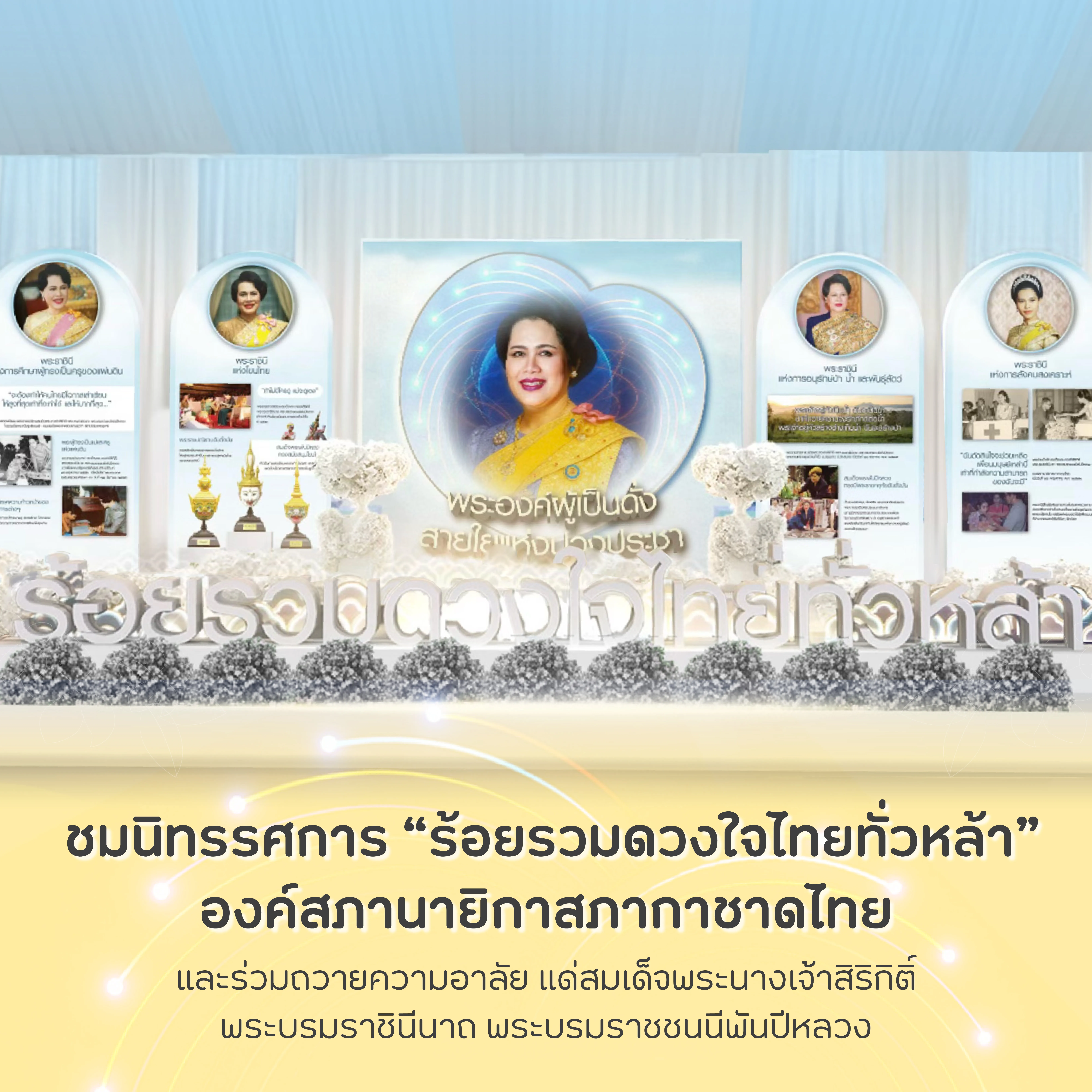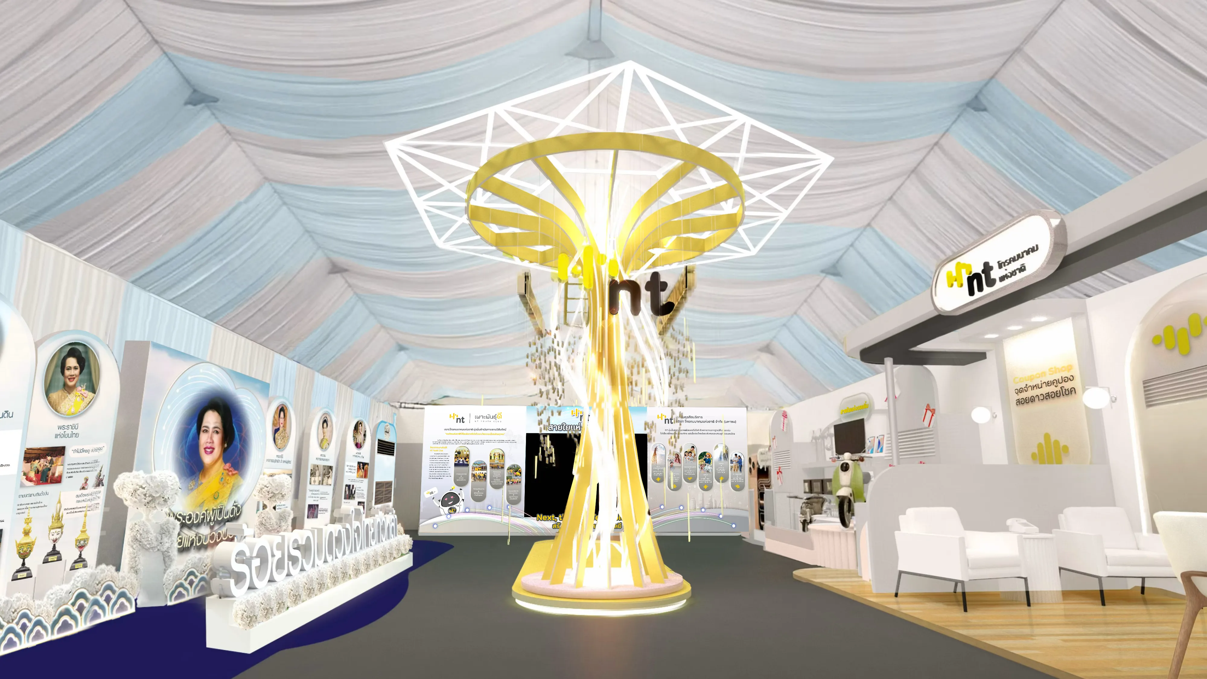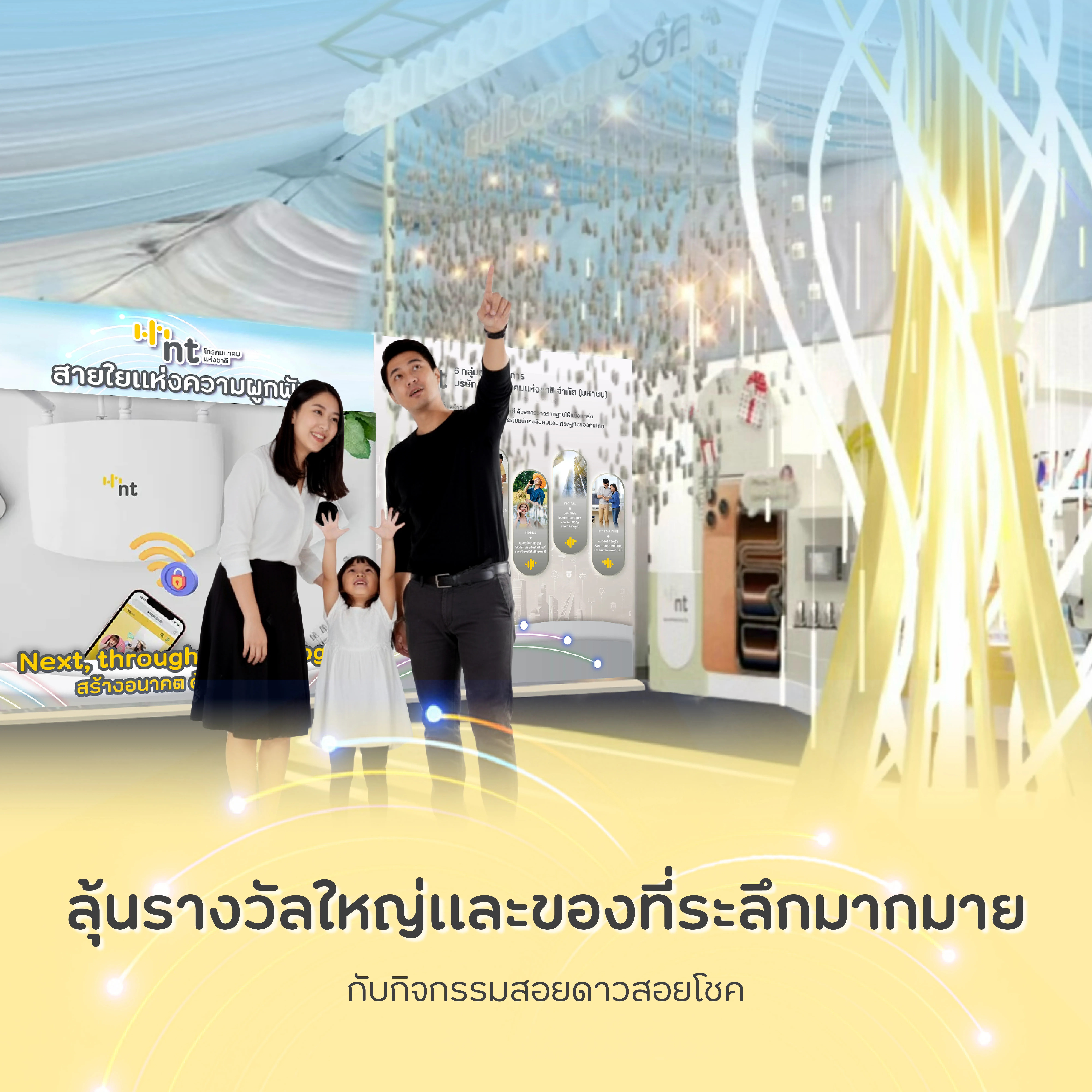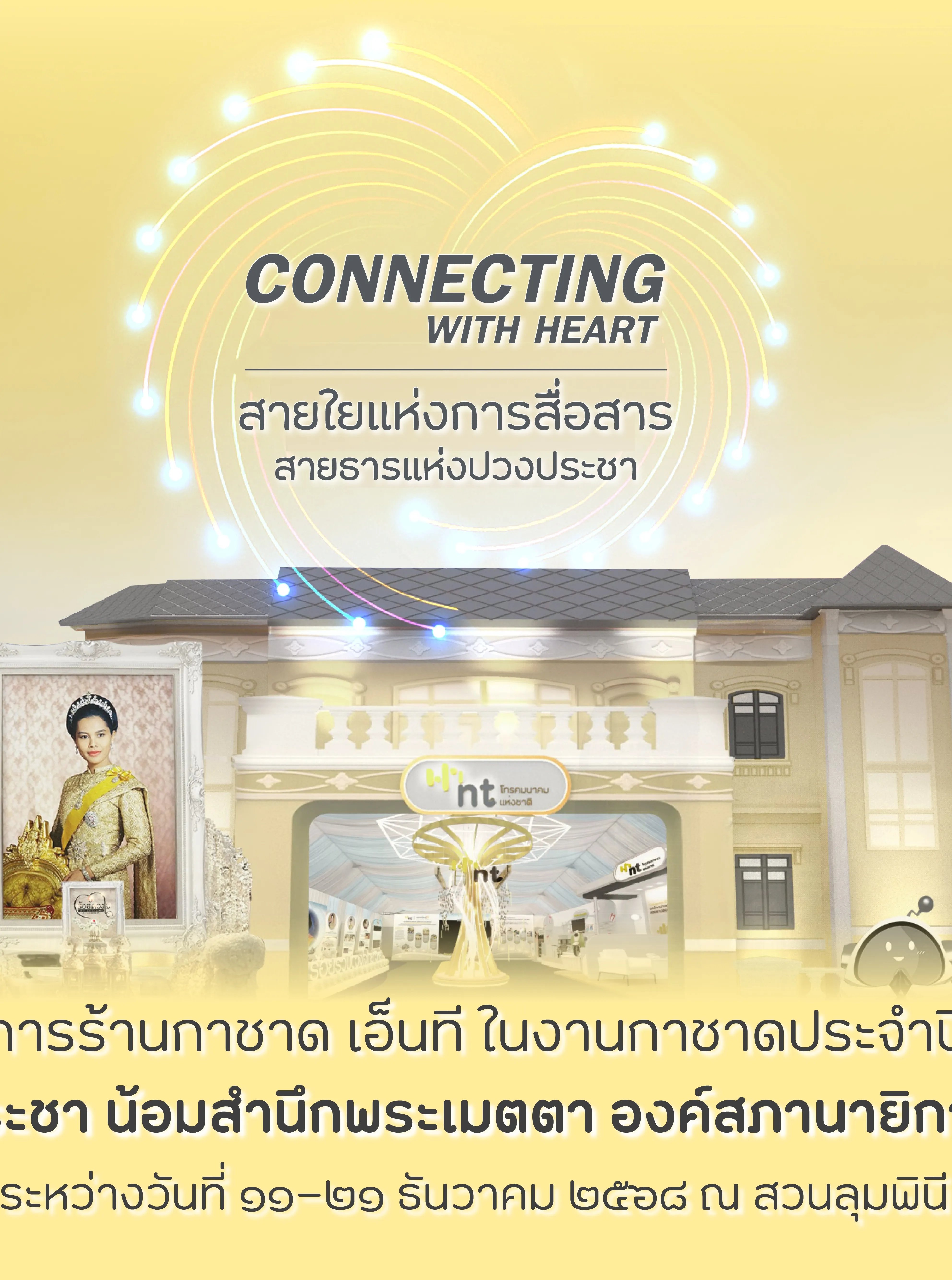 พร้อมร่วมชมบูธนิทรรศการเฉลิมพระเกียรติ ของ บมจ.โทรคมนาคมแห่งชาติ ที่สืบสานแนวพระราชดำริสู่วิถีแนวคิด ภายใต้ชื่อ “ร้อยรวมดวงใจไทยทั่วหล้า” และสัมผัสประสบการณ์แห่งเทคโนโลยีการสื่อสารเพื่อคนไทยจาก เอ็นที ส่งมอบความสุขและรอยยิ้มด้วยกิจกรรม “สอยดาว สอยโชค” พร้อมของรางวัลมากมาย ระหว่างวันที่ ๑๑–๒๑ ธันวาคม ๒๕๖๘ ณ สวนลุมพินี กรุงเทพมหานคร โซน ๖ บูธเลขที่ ๖.๑๑ มาร่วมส่งต่อ “สายใยแห่งความผูกพัน” และร่วมแสดงความอาลัยด้วยหัวใจแห่งความจงรักภักดีไปกับเอ็นที
