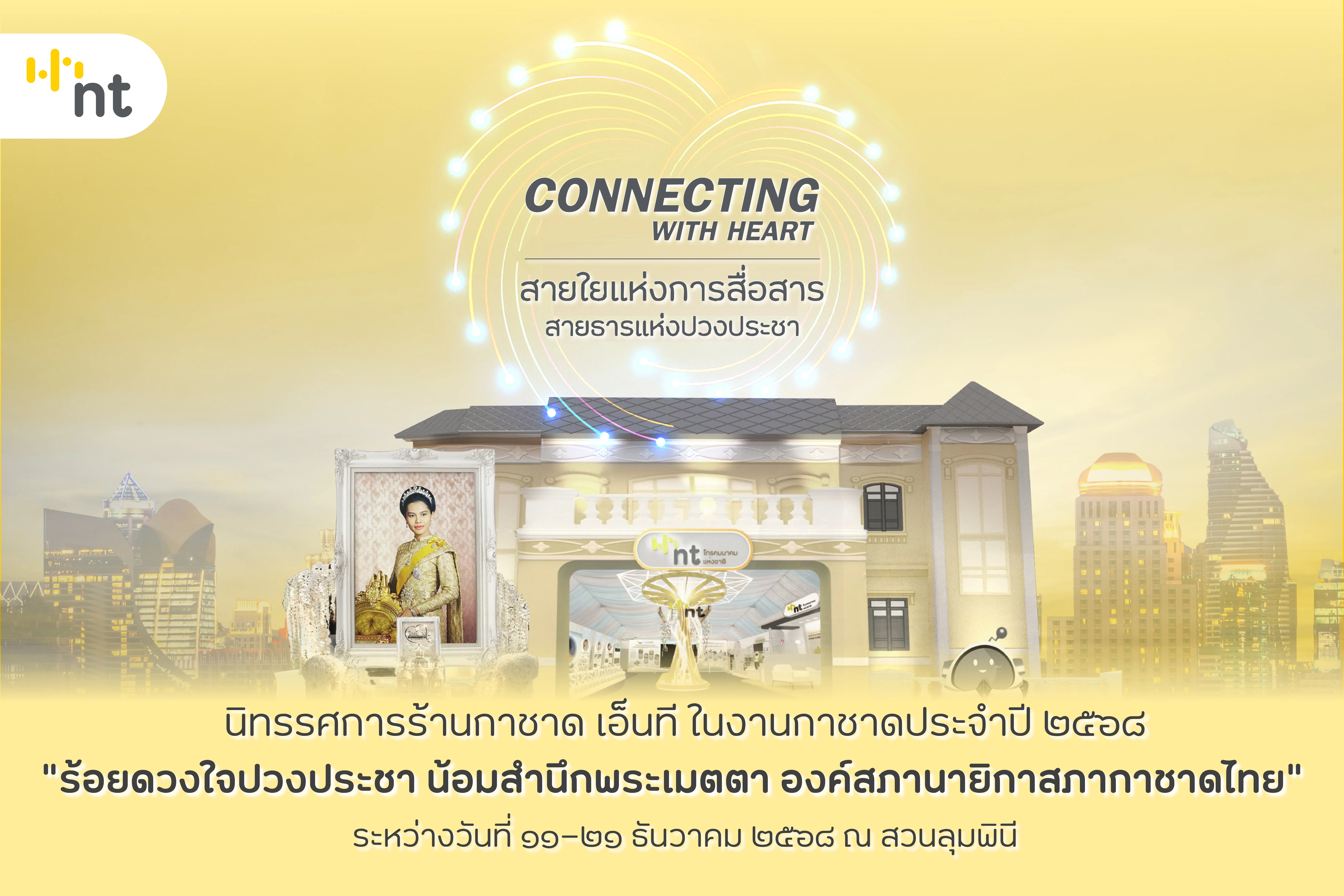 ขอเชิญชวนทุกท่านร่วมชมนิทรรศการร้านกาชาด เอ็นที (NT) ในงานกาชาดประจำปี พ.ศ. ๒๕๖๘ ภายใต้แนวคิด “Connecting with Heart – สายใยแห่งการสื่อสาร สายธารแห่งปวงประชา” ร่วมเป็นส่วนหนึ่งในการน้อมรำลึกในพระมหากรุณาธิคุณเป็นล้นพ้นอันหาที่สุดไม่ได้ สถิตในดวงใจตราบนิจนิรันดร์ แด่ “พระผู้ทรงเป็นแม่แห่งแผ่นดิน” สมเด็จพระนางเจ้าสิริกิติ์ พระบรมราชินีนาถ พระบรมราชชนนีพันปีหลวง องค์สภานายิกาสภากาชาดไทย ผู้ทรงมีสายพระเนตรและสายใยเพื่อปวงประชา