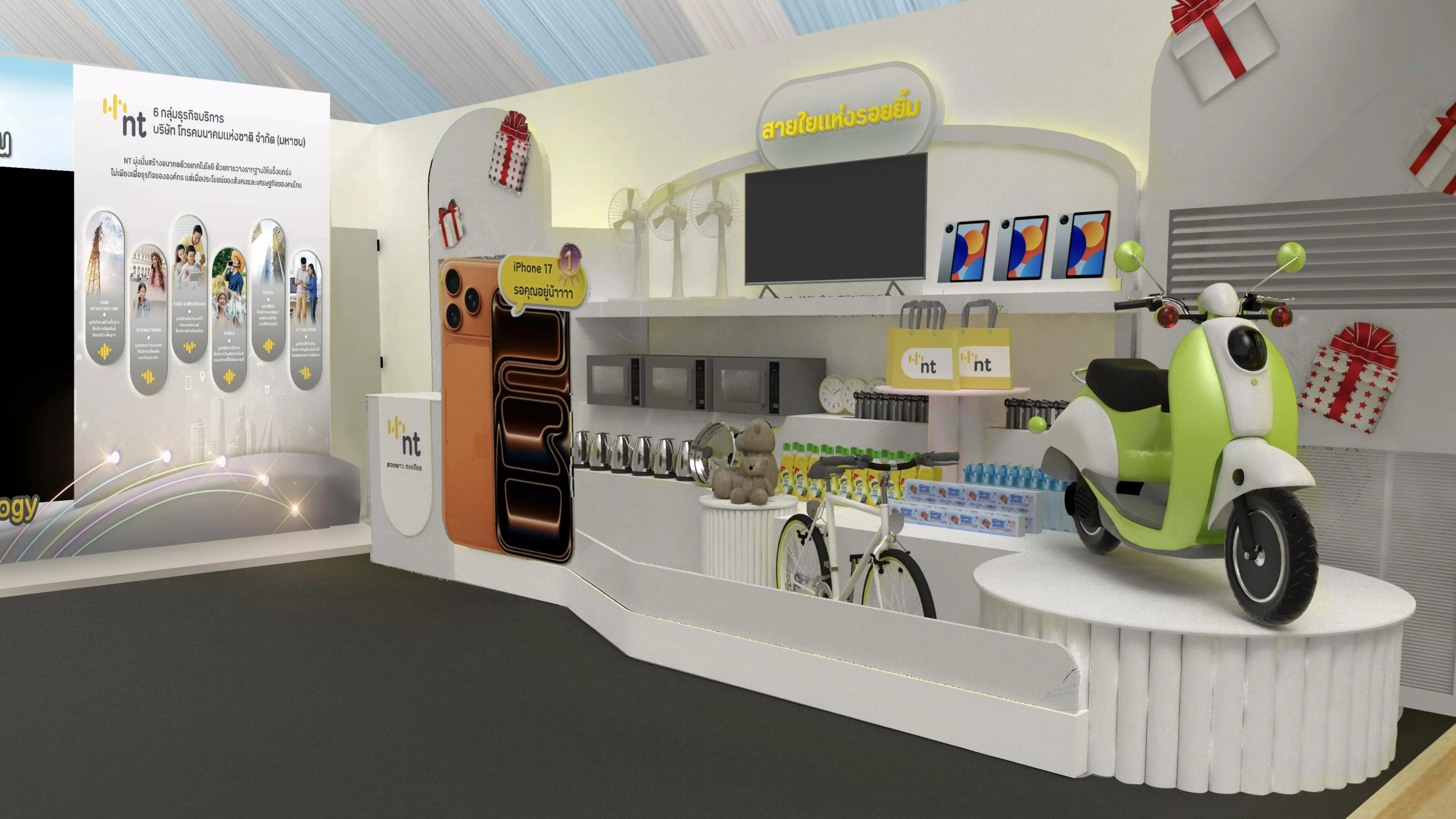เอ็นที ให้ความสำคัญกับการดำเนินงานเกี่ยวกับกิจกรรมเพื่อสังคมมาโดยตลอดอย่างต่อเนื่อง โดยจัดแสดงนิทรรศการประมวลภาพการดำเนินงานโครงการด้านความรับผิดชอบขององค์กรต่อสังคมและสิ่งแวดล้อมขององค์กร อาทิ โครงการ โครงการเพาะพันธุ์ดี NT Youth Club อีกทั้งยังนำเสนอวิสัยทัศน์ พันธกิจ และประชาสัมพันธ์ข้อมูล ๖ ธุรกิจบริการของ เอ็นที รวมถึงจำลองพื้นที่ร้าน NT Shop เพื่อให้คำแนะนำเกี่ยวกับบริการของ เอ็นที อาทิ บริการ my by NT / บริการ NT broadband เป็นต้น