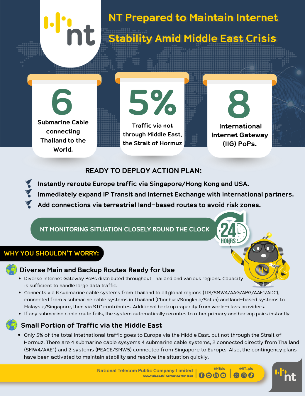 🌐 NT confirms that internet services in Thailand remain stable and are not affected by the situation in the Strait of Hormuz