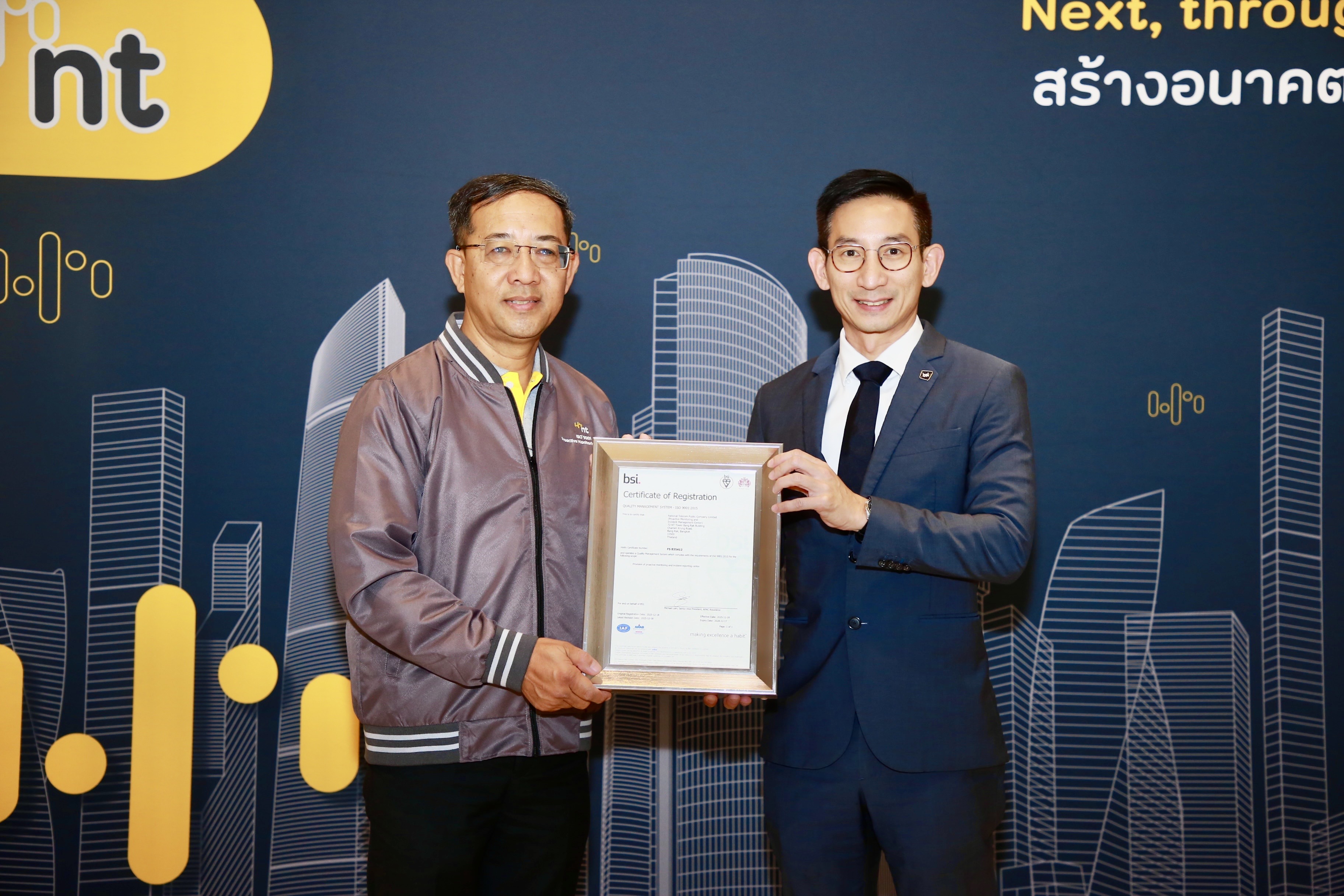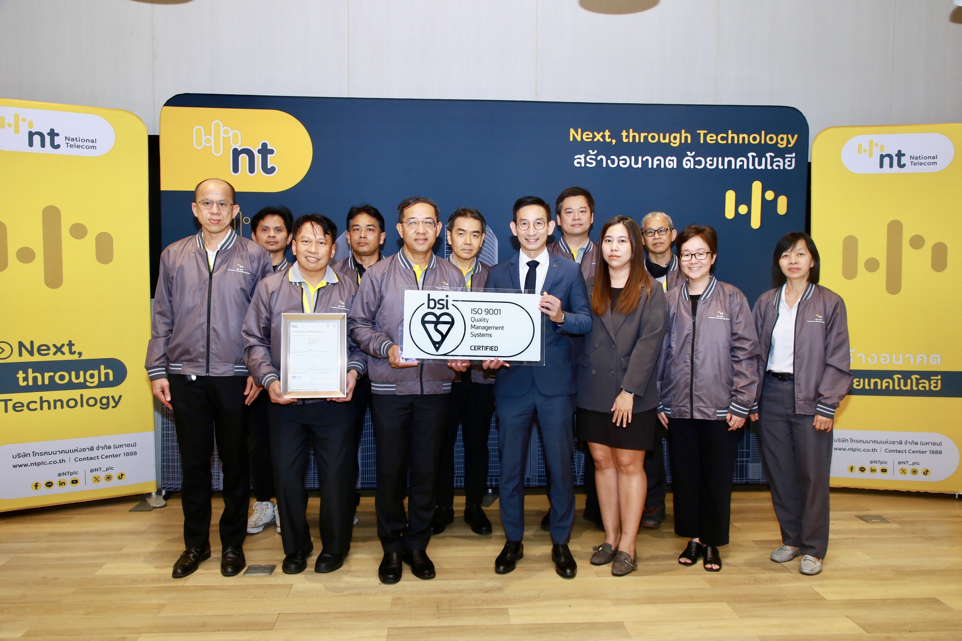 บริษัท โทรคมนาคมแห่งชาติ จำกัด (มหาชน) หรือ NT ได้รับใบรับรองระบบบริหารคุณภาพ ISO 9001:2015 สำหรับการให้บริการศูนย์เฝ้าระวัง และแจ้งเหตุวงจรขัดข้อง (Proactive) อาคารโทรคมนาคม บางรัก โดย นายปิยะ รัชตวรคุณ ผู้ช่วยกรรมการผู้จัดการใหญ่ กลุ่มขายและปฏิบัติการลูกค้า ภาคตะวันออก เป็นผู้แทน NT รับมอบประกาศนียบัตรจาก นายกุลธัช บุญบงการ ผู้จัดการประจำประเทศไทย บริษัท บีเอสไอ กรุ๊ป (ประเทศไทย) จํากัด