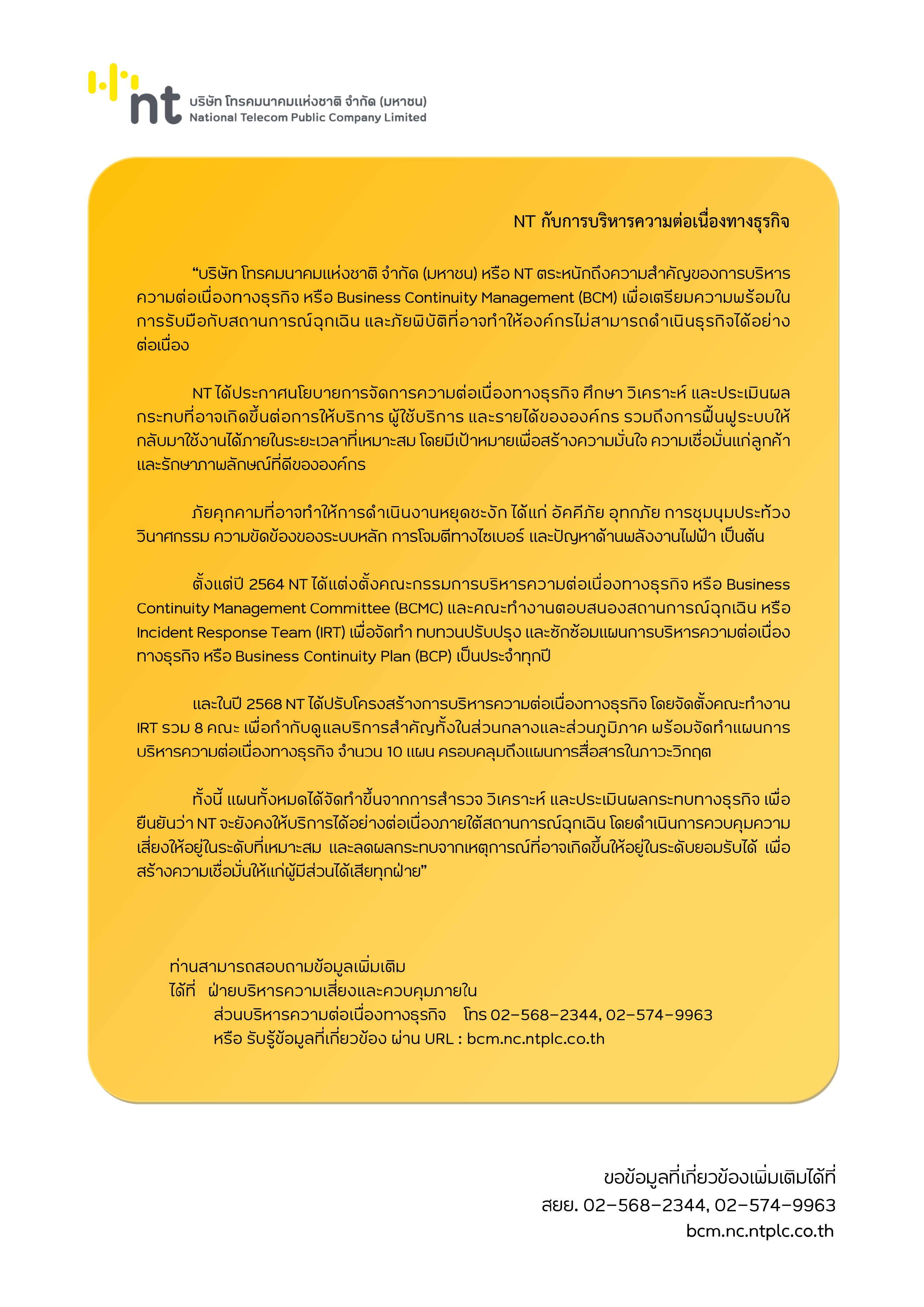 “NT ได้ปลูกฝังและมีการปรับปรุงแผนการบริหารความต่อเนื่องทางธุรกิจให้เป็นส่วนหนึ่งของการปฏิบัติงาน โดยได้จัดให้มีการซักซ้อมแผน Business Continuity Plan (BCP) เป็นประจำทุกปี ทั้งในระดับส่วนกลางและส่วนภูมิภาค เพื่อทดสอบความพร้อมของบุคลากร ระบบงาน และกระบวนการสื่อสารในภาวะวิกฤต ซึ่งช่วยให้เราสามารถตรวจสอบจุดแข็งและจุดที่ควรปรับปรุงได้อย่างเป็นระบบ อันจะนำไปสู่การพัฒนาแผนงานและมาตรการที่มีประสิทธิภาพยิ่งขึ้น และนำมาซึ่งการสร้างความเชื่อมั่นให้แก่ผู้มีส่วนได้ส่วนเสียในทุกภาคส่วน”
