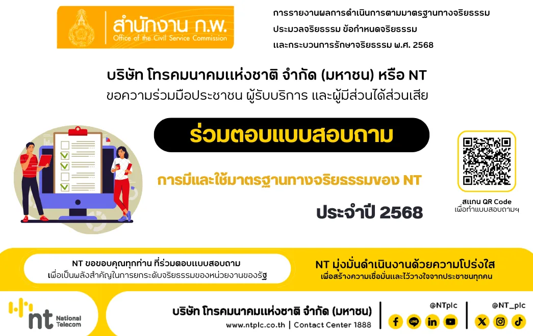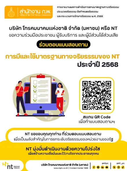 NT ขอความร่วมมือประชาชน ผู้รับบริการ และผู้มีส่วนได้ส่วนเสีย ร่วมตอบแบบสอบถาม การมีและใช้มาตรฐานทางจริยธรรมของ NT ประจำปี 2568