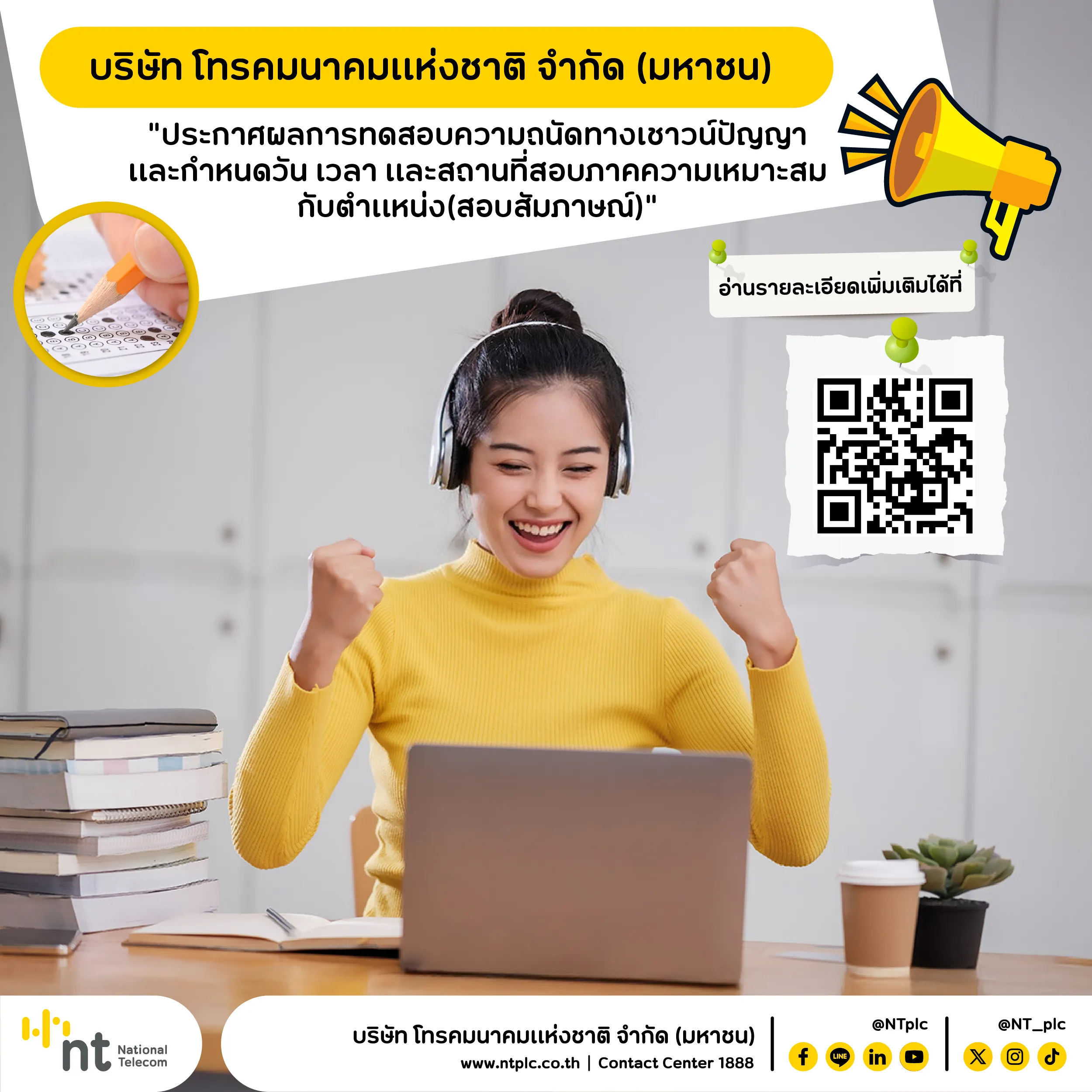 บริษัท โทรคมนาคมแห่งชาติ จำกัด (มหาชน) "ประกาศผลการสอบข้อเขียนและกำหนดวัน เวลา สถานที่ทดสอบความถนัดทางเชาว์ปัญญา"