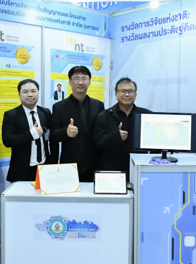 สุทธเตมีย์ และคณะ โดยมี นายวรวิทย์ รอดอนันต์ ผู้จัดการฝ่ายนวัตกรรมองค์กร NT ร่วมแสดงความยินดี ณ Event Hall