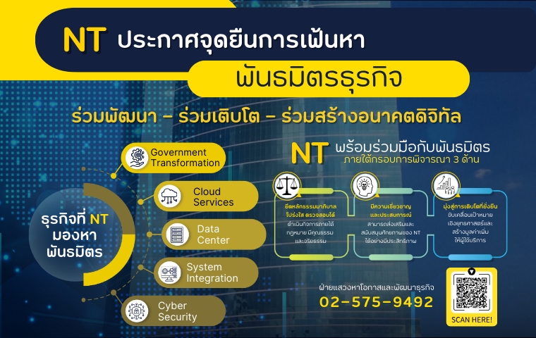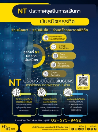 ในโอกาสนี้ NT ใคร่ขอเชิญหน่วยงานทั้งภาครัฐและเอกชนที่สนใจเข้าร่วมเป็นพันธมิตรทางธุรกิจ เพื่อสร้างความเข้มแข็งทางธุรกิจร่วมกันได้ที่ ฝ่ายแสวงหาโอกาสและพัฒนาธุรกิจ โทรศัพท์ 02-575-9492