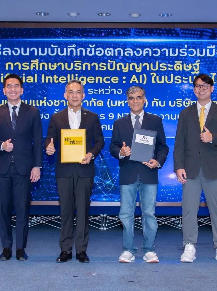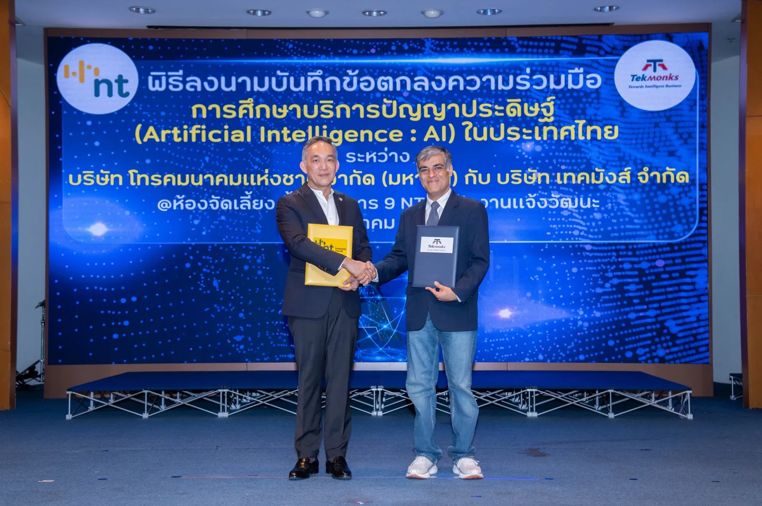 พันเอก สรรพชัยย์ หุวะนันทน์ กรรมการผู้จัดการใหญ่ บริษัท โทรคมนาคมแห่งชาติ จำกัด (มหาชน) (NT) และ นาย โรห์อิท กาพอร์ ประธานบริษัท เทคมังส์ จำกัด (TekMonks) ลงนามบันทึกข้อตกลงความร่วมมือ (MOU) ศึกษาบริการปัญญาประดิษฐ์ (Artificial Intelligence: AI) ในประเทศไทย มุ่งเป้าหมายพัฒนาโซลูชันด้าน AI โดยมี ดร.วงกต วิจักขณ์สังสิทธิ์ รองกรรมการผู้จัดการใหญ่ สายงานดิจิทัล NT และ นายปัณณวิชญ์ นวลพรหมสกุล กรรมการผู้จัดการ บริษัท เอดี โปร เทคโนโลยี จำกัด ร่วมงาน ณ อาคาร 9 สำนักงาน NT แจ้งวัฒนะ